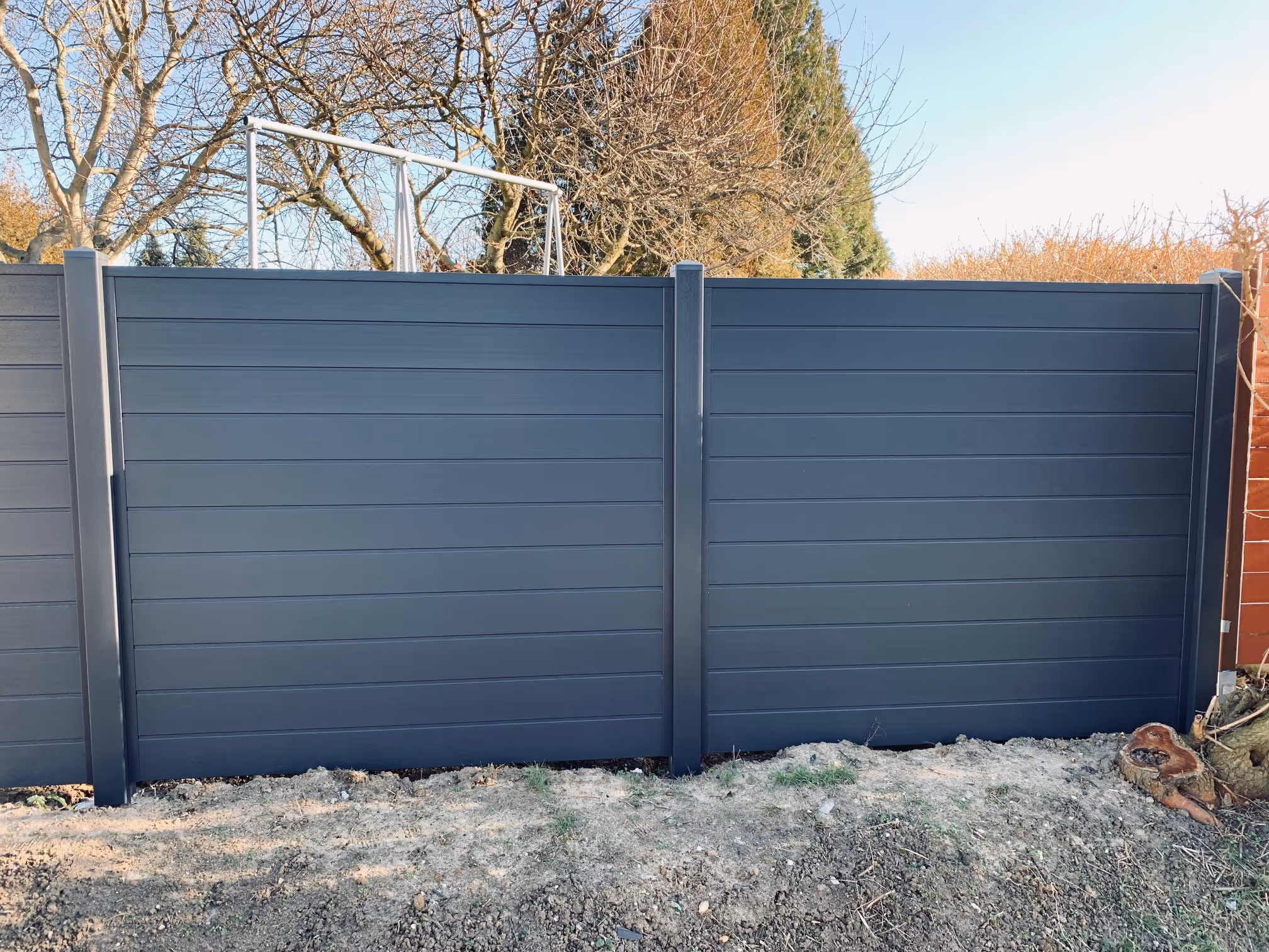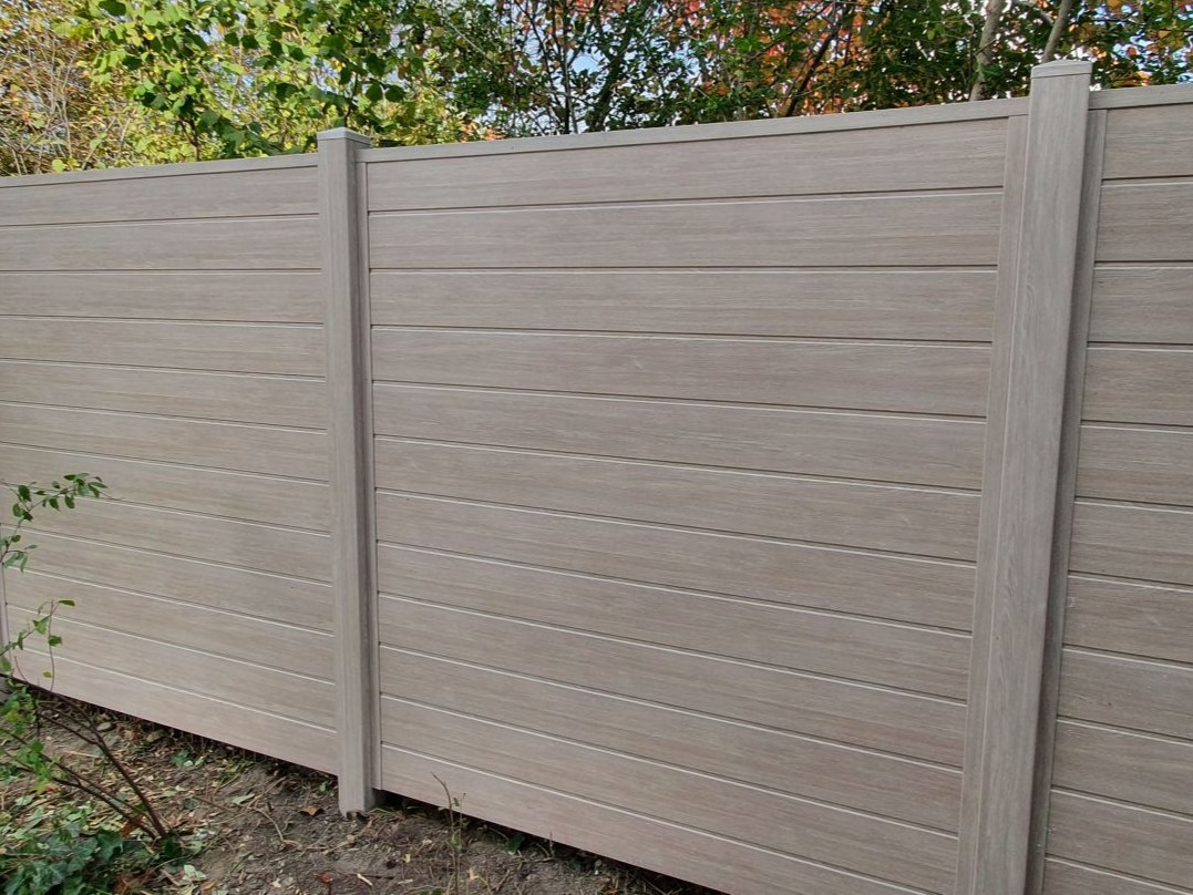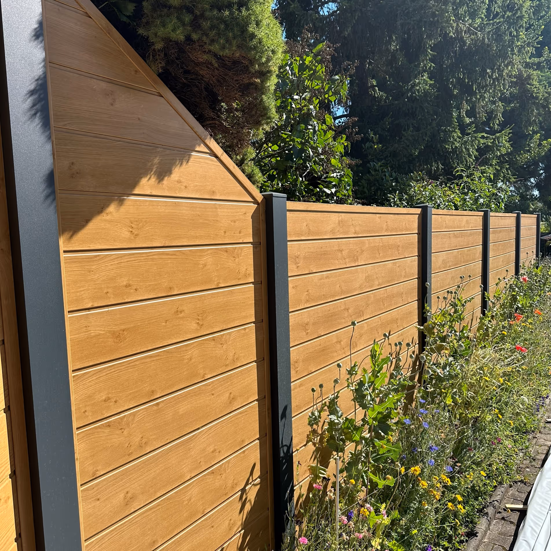 Dank dieser flexiblen Montageweise lässt sich der Zaun harmonisch in unterschiedliche Umgebungen integrieren. Die farblich abgestimmten Pfosten sorgen dabei für ein einheitliches, elegantes Erscheinungsbild und schaffen eine moderne, stilvolle Abgrenzung im Außenbereich.